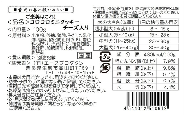見た目良し、味良しのチーズ入りミニクッキーです。小型犬から大型犬まで、ご褒美にピッタリのおやつです。