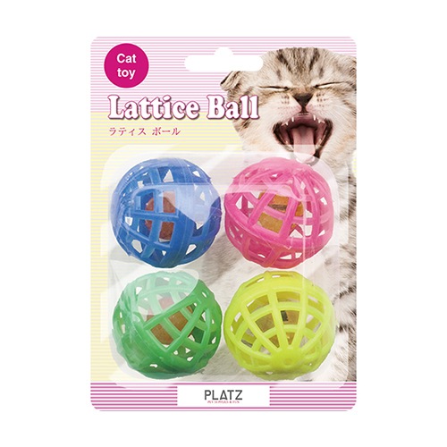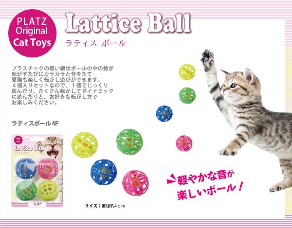 プラスチックの軽い網状ボールの中の鈴が転がすたびにカラカラと音をたて、猫ちゃんも楽しく転がし遊びが出来ます。 4個入りセットなので、1個でじっくり遊んだり、たくさん転がしてダイナミックに遊んだりと、お好きな転がし方でお楽しみください!