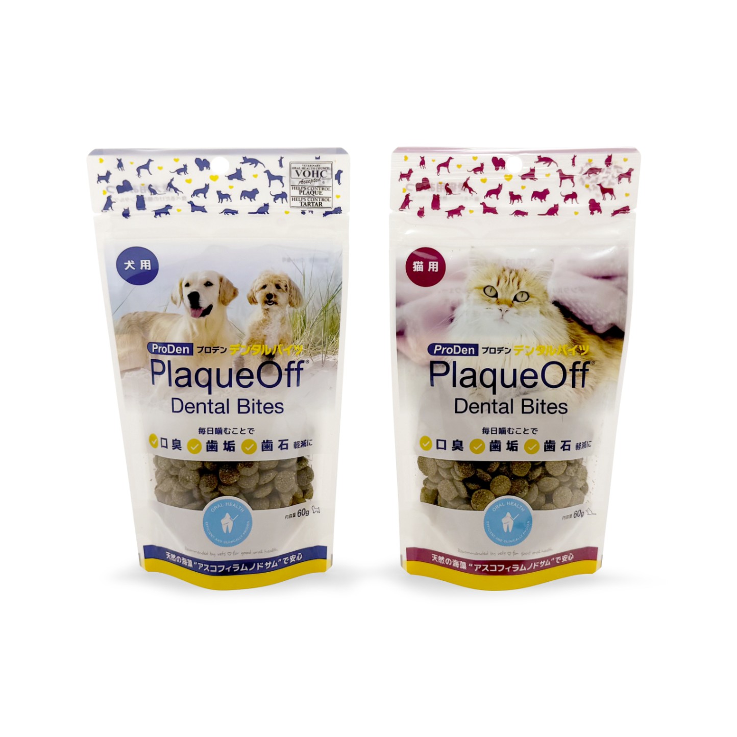 天然の海藻(アスコフィラムノドサム)を主原料とする安全な犬猫用のデンタルおやつです。毎日食べることで口臭や歯垢、歯石付着が減少する効果が認められており、この効果は世界40カ国で特許を取得しています。(日本第4648611号)