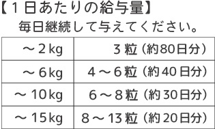 下記の容量を目安に、おやつとして毎日継続して与えてください。 ●ペットの体重が2kgまで 1日あたりの給与量:3粒 ※60g入り1袋あたり約80日分 ●ペットの体重が6kgまで 1日あたりの給与量:4~6粒 ※60g入り1袋あたり約40日分 ●ペットの体重が10kgまで 1日あたりの給与量:6~8粒 ※60g入り1袋あたり約30日分 ●ペットの体重が15kgまで 1日あたりの給与量:8~13粒 ※60g入り1袋あたり約20日分
