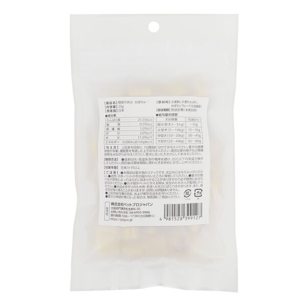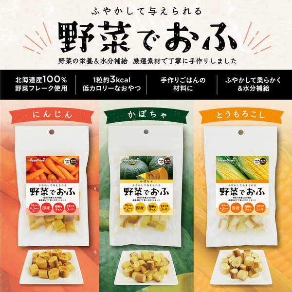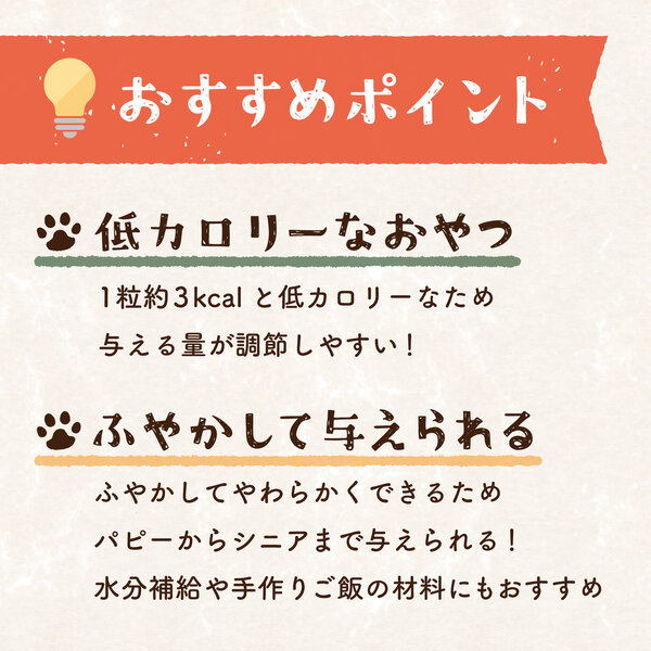 一つ一つ手作りで丁寧に作られた国産のお麩スナック。油分・糖分・塩分不使用。北海道産の野菜フレークを使用し野菜の栄養と美味しさをプラスしました。そのまま与えても、お水でふやかしてもOK。手作りごはんの材料としてもおすすめです。一粒3kcalと低カロリーで、毎日与えられるおやつです。超小型犬~高齢犬まで対応しています。