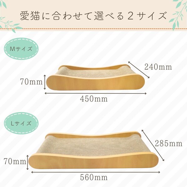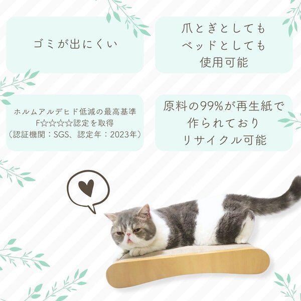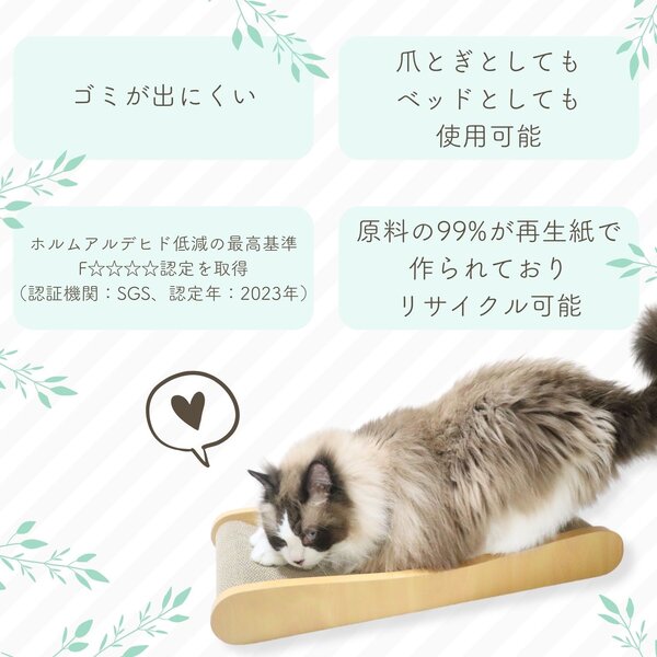 爪とぎとしてもベッドとしても使用可能な猫用つめとぎベッド。 爪とぎの目が細かくゴミが出にくいのが特長。 裏面も使用可能なので長くご利用いただけます。 質の高い再生紙を使用し、環境にも配慮した商品です。原料の99%が再生紙で作られておりリサイクル可能です。 Mサイズは小さめネコちゃん用です。 本商品はホルムアルデヒド低減の最高基準のF☆☆☆☆認定を取得しています(認証機関:SGS、認定年:2023年)。