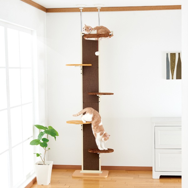 場所を取らず、省スペースでおしゃれなデザインの猫ツリー。ハンモックは猫ちゃんの裏側が見えるクリア仕様。背面は爪とぎができるスクラッチパネル付き。とぎクズが出にくい麻生地を使用。床から天井までの高さは210cm~273cmの範囲で調整可能です。●棚板・ハンモック1段耐荷重:8kg