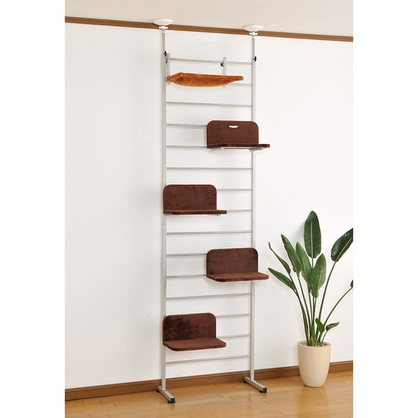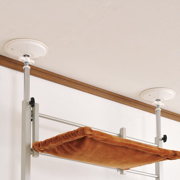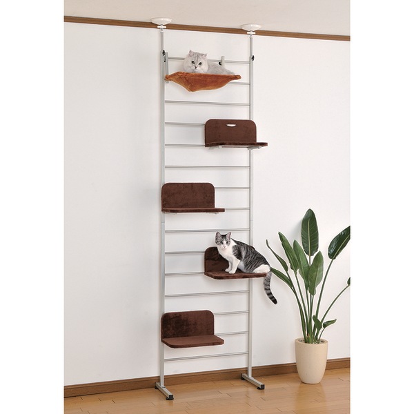 場所を取らず、省スペースでおしゃれなデザインの猫ツリー。棚板やハンモックは上下左右、お好きな位置に固定できます。床から天井までの高さは228cm~273cmの範囲で調整可能です。●本体総体耐荷重:15kg ●棚板・ハンモック1段耐荷重:5kg
